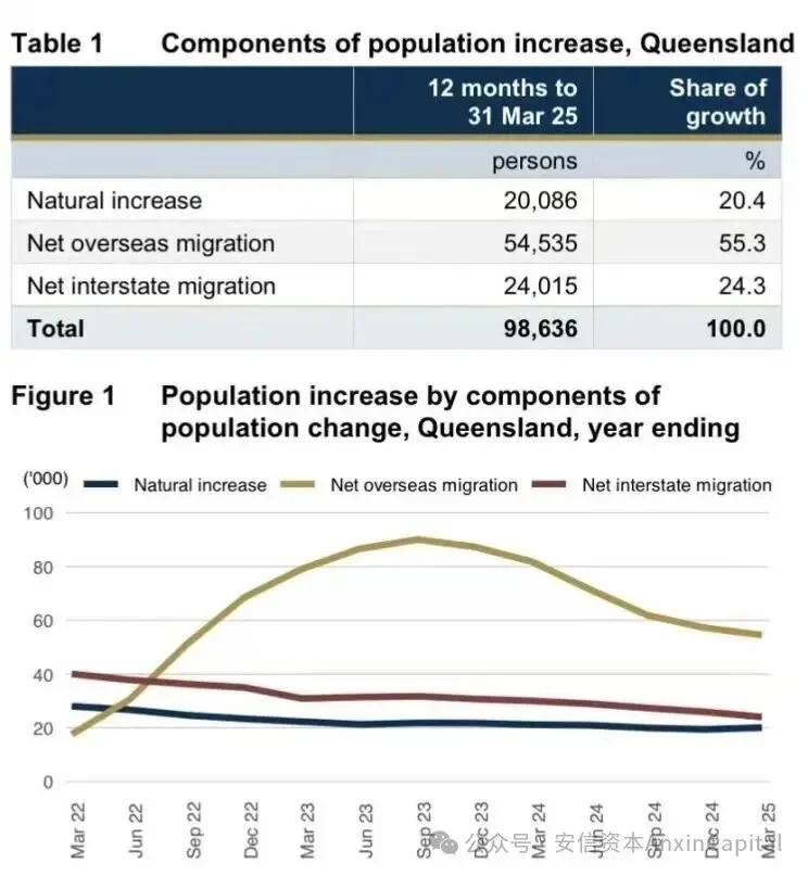 -跨州移民持續流入:2025年第三季最新數據,昆士蘭州季度淨跨州移民達到+8950人,年增高達21.2%。